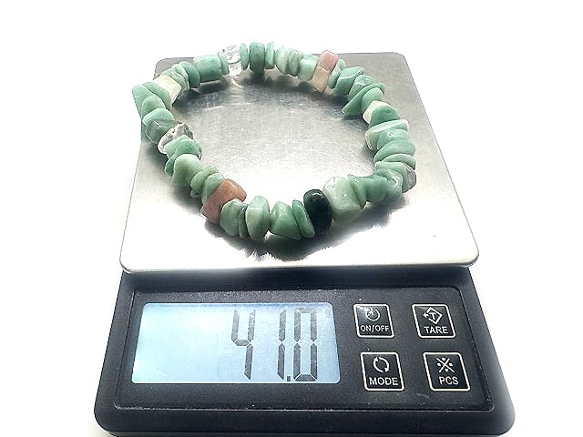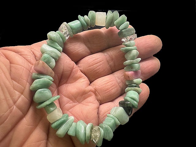 久々の更新ですが、ブルーグリーンアゼツライトの細石のシナジーブレスレットを作成してみました。手元の細石にすべて穴を開けて全て使用した関係で、5枚目の画像のようにめちゃくちゃ大きなブレスレットになってしまいました(汗)ただ、購入をご希望の方には、ブレスレットのサイズ変更をいたしますのでご安心してください。