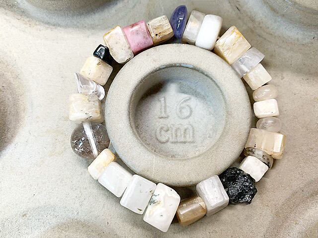 シナジー13チャンクブレスレットと言っても、毎回、構成とか諸々異なるのでカスタム感はあるのかと思います。今回は、ブローカイトinクォーツが無駄に16㎜くらいあったり、タンザナイトとか大きめです。後は、フェナカイトは小さ目ですがロシア産を使用しています。フェナカイト原石Mを加工しました。その分、ヘルデライトを大きいものを使用しています。